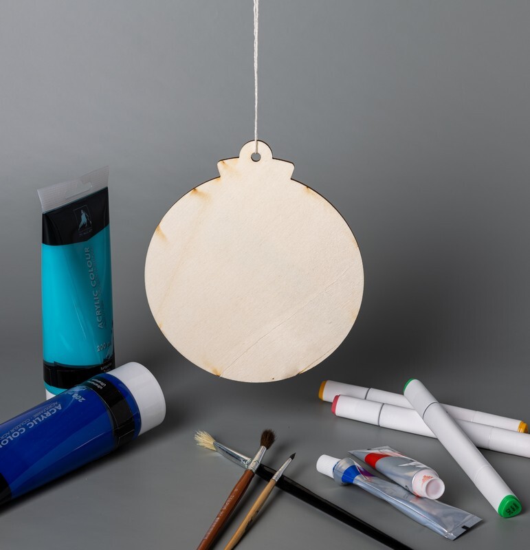 Drevená dekorácia v tvare vianočnej gule na zavesenie napríklad na vianočný stromček.